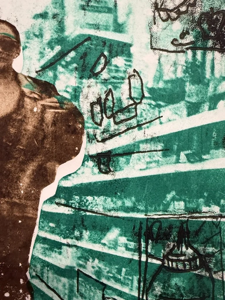 My work begins in the small moments that linger (an overheard laugh, a gesture at the cashrap, or the song that played) and grows into paintings, prints, and photographs that hold memory and emotion in wordless color and form. I work with the tools of my creative lineage to layer symbols, text, and graphic overlays that trace connections across time and space. Film photography and framing often anchor my process, mimicking composition and petrification of memory: recollections preserved as shapes and figures. I treat color as both prayer and dialogue, introducing tones to one another until they reveal kinship, tension, or resolution.